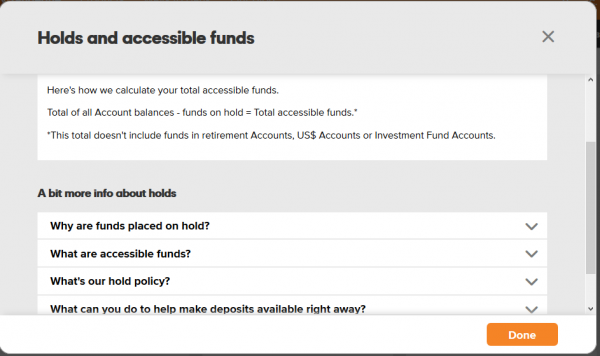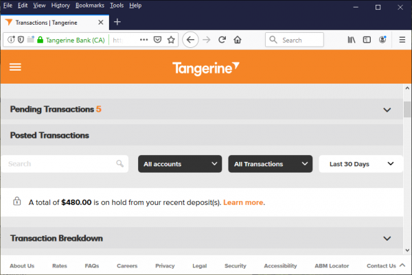 OfflineLooks like Tangerine re-shuffled their FAQ - the hold policy link I provided in #4 is now stale. I find it quite tricky to check one's on hold and accessible funds. During an online chat, I was told