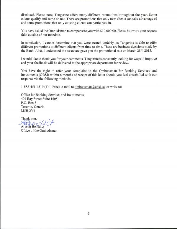 This doesn't indicate to me that the Ombudsman for Banking Services and Investments has taken up an investigation, although they probably will do at least a basic investigation, nor that there might be light at the end of the tunnel on this, as Top It Up alluded to in another thread on these forums about a 2.75 270 day HISA targeted promotion from Tangerine's marketing department.