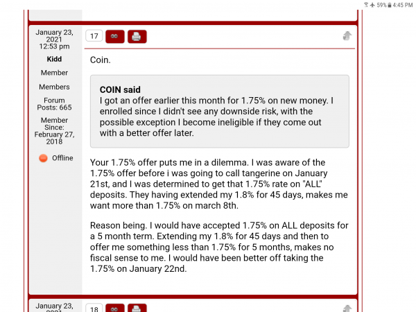 MG, go digging in the old tangerine threads. They extended my offer by 45 days and in that time, their intetest rate dropped by a 1/4%. I would have been better off NOT getting the extension, and they'd still have my money. The world would be a better place without the likes of tangerine. Take that to the bank.