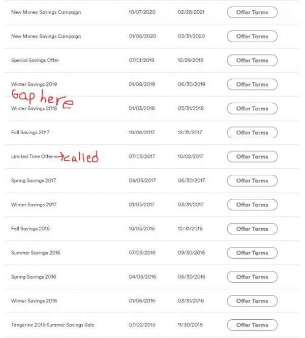 OfflineAdam1, my experience with Tangerine is if you accept an offer you won't get another one before or when it expires, you have to be on their regular rate for a while (i.e. that's when the account is empty) and then another offer comes months or years later. I usually call in the day after my offer expires and they put me on another promo, albeit not usually quite as good as the offers they freely send out to the clients of their choice. The few times I've declined I find within a few months I get another unsolicited offer. That's my experience, others here have different experiences. For some reason they seem to want to keep my business, others on here say they rarely or never get offers, not my experience at all. I do have and use a bit their credit card, I've got their chequing account, and I'm a super-friendly charmer on the phone (never a harsh word for their great company, never complain that they're not giving me the absolute top rate out there, just wondering if they've got a promo for me before I go through the bother of transferring my money out), but I'm not sure if any of that affects anything.