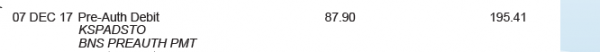 <--- This is my Scotiabank SCENE Visa credit card pre-authorized payment transaction. Note the odd "third-party name" so it shows it's dependent upon what the payee has set up (in this case, Scotiabank) as the other information. I haven't yet asked Scotiabank what on Earth "KSPADSTO" means. Best I've come up with is that TO means the contact centre that set it up, PADS refers to "pre-authorized debit service" possibly and KS might mean the initials of the contact centre agent that it set up (she had a first name that started with a "K"). Seems logical.
