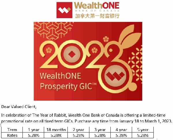 I got their e-mail this morning on this. 18Mo also @5.28%. Darn, I have purchased my TFSA GIC for this year from RBC @5.03%. I'm already at the limit covered by CDIC with Wealth One for non registered funds. Tempting to add a small one for one year? Thing is nothing with them is coming due this year either so the risk would last until next year.