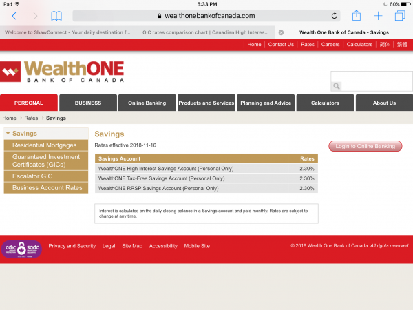TFSA also 2.3% now? | Wealth One Bank of Canada | Discussion forum This forum requires Javascript to be enabled for posting content Please consider registeringguest Log In Register Login name Password Remember me Register | Lost password? Select Forum Announcements New members welcome and introductions Site suggestions Credit card reward programs General comparisons General financial discussion GIC discussions Income tax filing Investing Mortgages RRSPs and RRIFs Small business accounts Tax Free Savings Accounts Your stories Achieva Financial Alterna Bank BMO Bridgewater Bank Canadian Tire CIBC Coast Capital Savings DUCA Credit Union EQ Bank Hubert Financial ICICI Bank Ideal Savings Laurentian Bank LBC Digital Luminus Financial Manulife Bank MAXA Financial MCAN Financial Meridian Credit Union Motive Financial motusbank National Bank Neo Financial Oaken Financial Omnia Direct Outlook Financial PC Financial Peoples Trust RBC Royal Bank Saven Financial Scotiabank Simplii Financial Steinbach Credit Union Tangerine Bank Vancity Wealth One Bank of Canada Wealthsimple AcceleRate Financial Ally B2B Bank Citizens Bank HSBC Implicity Financial Wyth Financial (formerly Concentra Bank) Zag Bank Zenbanx Search Advanced Search Advanced Search— Forum Scope —Current forumAll forums— Match —Match any wordMatch all wordsMatch phrase— Forum Options —Posts onlyTopic titles onlyPosts and topic titlesMinimum search word length is 3 characters - maximum search word length is 84 characters Search Home Discussion forum Wealth One Bank of Canada TFSA also 2.3% now? Topic RSS TFSA also 2.3% now? Facebook Twitter Email this November 17, 20182:38 pm Vatox Member Members Forum Posts: 1218 Member Since: October 29, 2017 Offline 1 Was just looking at rates and noticed this. Can others verify? Maybe the comparison chart needs an update? November 17, 20183:05 pm Peter Admin Forum Posts: 1493 Member Since: May 15, 2007 Offline 2 Thanks for the heads up! I've updated the chart now. November 17, 20184:41 pm Vatox Member Members Forum Posts: 1218 Member Since: October 29, 2017 Offline 3 This is good, I don't have to wait for EQ to get a TFSA now. November 17, 20185:36 pm Vatox Member Members Forum Posts: 1218 Member Since: October 29, 2017 Offline 4 Looks like Nov. 16 may have been the date it was changed. All RSS © Simple:Press New/Recently Updated Topics Up/Down Vote, Block User Brokerage investment savings accounts Finding the best GIC Rates TFSA with EQ? 24/5 Round-The-Clock U.S. Stock Trading … Amazon.ca knows too much about us???? Vanilla Prepaid Visa Card (product of Pe… Windows 11 Pros & Cons Laurentian LBC and B2B become the latest… External Transfers with Meridian New Promo Savings Accounts 4.70% (385% +… Motive Financial accounts migrating to N… Whaaat? Just this and no chocolates this… GIC stuck in processing Oaken App Issue & Voice Authenticati… Problems & Issues Linking External A… Limited Time Offer!! Open 1st Simplii TFSA to earn 3.90% for … Grow your savings with an amazing 2.75%*… Tangerine GIC rates