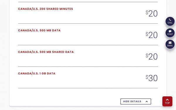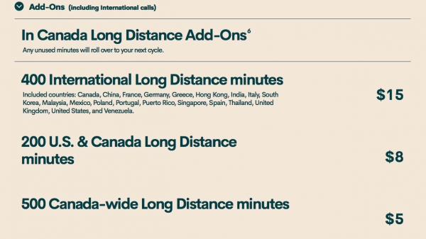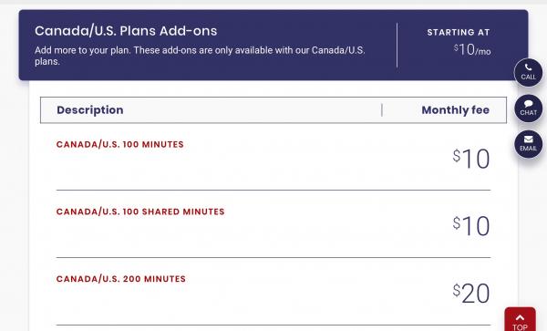 See pic from their revised and new website for $5 addon for 500 minutes, Canada Wide.